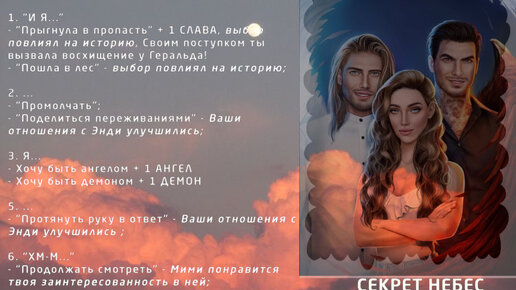 СЕКРЕТ НЕБЕС «Обретённые крылья» (Клуб Романтики) 1 сезон 1 серия Готовый Гайд Ниже я поэтапно покажу вам прохождение к первой главе. Для начала выберите как будет выглядеть ваш персонаж. Вы можете выбрать...