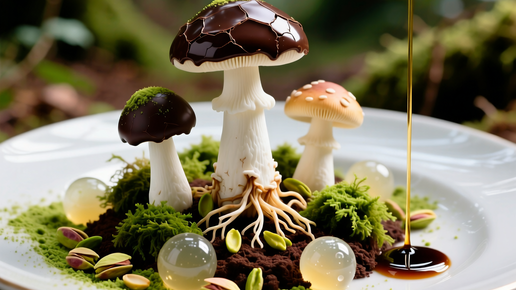 Игра на контрасте восприятия. Гости думают, что едят грибы, но это — сладкое. Этот десерт — игра для ума и наслаждение для вкусовых рецепторов. Мы заменим сложные техники на доступные, но сохраним магию обмана. Вам понадобится (на 4 порции): Для «шляпок грибов» (шоколадный мусс): Для «ножек грибов» (сладкие безе): Для «мха» и «почвы»: Для сервировки: _Как сделать грибной порошок: Купите в отделе приправ немного сушеных белых грибов (это не редкость). Размелите их в кофемолке или мощном блендере до состояния очень мелкой пудры...