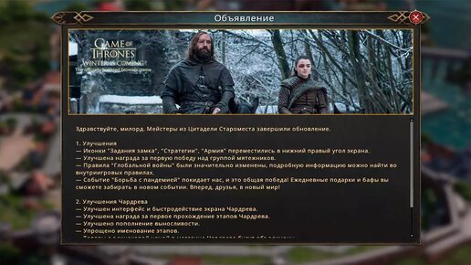 25 мая 2023 года в онлайн стратегии Game of Thrones: Winter is Coming установили обновление с улучшениями и ивентом. Существенно обновили интерфейс и функционал Чардрева. Экран Чардрева получил оптимизацию и новый интерфейс. Повышено качество награды за первое прохождение этапов. Объединены товары с одинаковой ценой, переименованы этапы и улучшено восполнение выносливости. Первая победа над группой мятежников принесет больше призов...