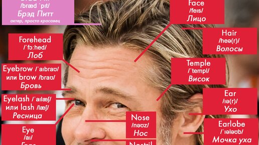 С помощью Брэда Питта, актера и просто красавца-мужчины, мы сделали для вас наглядную карточку, посвященную самым важным терминам в современном английском, связанным с человеческим лицом, от, собственно,...