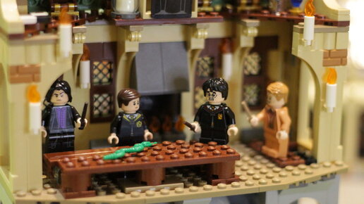 Сегодня покажу два набора из серии по Гарри Поттеру: "Тайная комната" и "Ошибка с оборотным зельем". По задумке этого конструктора, Тайная комната расположена под Большим залом, но отдельный набор с Большим залом у меня уже есть и он по исполнению более интересный, чем Большой зал в наборе "Тайная комната". Поэтому я переставила еду со столов и трибуну-сову из этого набора в тот, другой Большой зал, убрала лишние детали, сдвинула столы в центр и сделала тут Дуэльный клуб, а именно сценку дуэли между...