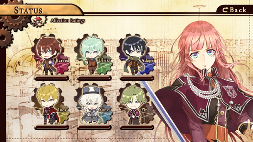 Перейдём, пожалуй, к самому интересному во всех отомках, это к параду мужиков. Веток здесь не так много, всего 6, которые условно можно поделить на три группы: Нижний мир: (Эльткрид и Ульрик); Убежище (Инес и Адаже); Верхний мир (Финн и Юне). И, казалось бы, логичнее было бы проходить новеллу, именно ориентируясь на это деление и на личные предпочтения. Но «Паровая тюрьма» ‒ это отоме, в которой сюжет единой нитью проходит через все ветки, и только правильные выборы (благо в игре есть маркеры отношений) помогут выйти на тот или иной рут...