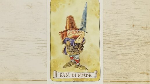 Для расклада на вторник беру колоду "Таро Гномов", чтобы немного поменять энергии и не привязывать гномов исключительно к среде, как это складывается на канале. Вытаскиваю младший аркан - "Паж Мечей", который имеет дополнительное название - "Фанатизм". Паж Мечей уже несколько раз приходил к нам на расклад в очень необычных образах, в том числе и женских (ссылка на подборку - в конце статьи). Гномий Паж Мечей весьма традиционен - он стоит в картинной позе, держа меч двумя руками. Единственное, что отличает его от уэйтовского канона - взгляд направлен на сам меч, а не в сторону...
