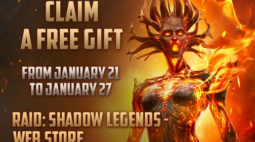 : «Мы подготовили для вас приятные бонусы: заберите 7 разовых подарочных предложений в период с 21 по 27 января. Предложения доступны в веб-магазине RAID: Shadow Legends, в официальном приложении для Android или через Plarium Play на ПК»...