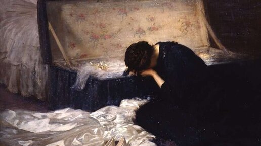 На этой картине мы видим женщину, которая стоит на коленях возле открытого сундука, грустно склонив голову. Рядом на полу лежит свадебное платье и стоят свадебные туфли. Что же здесь происходит? Героиня склонилась над сундуком, положив голову на руки, и по-видимому, плачет. Склонённая над сундуком фигура женщины, лицо которой скрыто от зрителей, передаёт её горе и печаль. Также о скорби героини свидетельствует и её чёрное платье. Судя по всему, героиня — молодая вдова, которая совсем недавно вышла замуж, но в силу каких-то обстоятельств потеряла своего супруга...