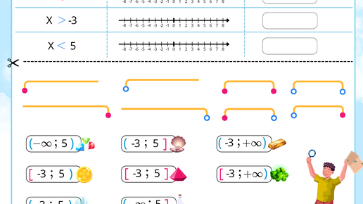 К каждому неравенству 📜 подберите 🔑 изображение и обозначение числового промежутка. 8 шагов → 8 сокровищ! 🤩 📎 Бесплатно: 🖼 PNG-версия — для печати и интерактивной доски 🧩 Готовая доска в Chattern ❤️ = Спасибо!...