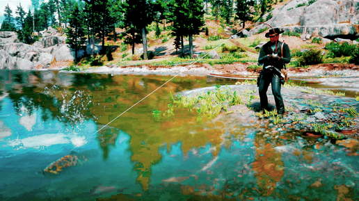 Квест «Ловец рыб» по поимке легендарной рыбы для рыболова Джереми Гилла. 1. Легендарный малоротый окунь. Для поимки легендарного малоротого окуня нужно отправиться в одно из самых красивых мест в игре – озеро Ованджила. Будьте осторожны – здесь могут напасть волки… Как только Артур пройдётся по правому берегу озера, на экране появится информация о том, что он «достиг места обитания…», а на карте – рисунок рыбы с короной. Встать для рыбалки нужно на берегу прямо напротив рисунка на карте и забросить...