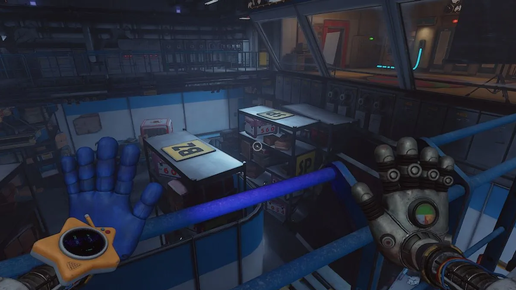 Вы появляетесь у входа на фабрику. Пройдите направо и зайдите в комнату. Там вы увидите игрушечный паровозик, это подсказка. Как можно заметить, он расскажет разные цвета. (Зелёный, розовый, жёлтый, красный.) Это пароль от комнаты охраны. Развернитесь и пройдите туда. Введите код на специальные панели. Дверь откроется и на столе в углу возьмите синюю кассету и вставьте её видеомагнитофон. Посмотрите обучение по использованию grab pack. Зачем откроется маленький шкафчик, и возьмите grab pack. Пройдите обратно в главный холл и перепрыгните через турникет...