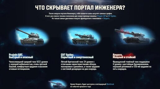 Как получить танки из портала инженера? На этот раз можно получить 4 машины: * Стартер Инженера для открытия портала можно бесплатно получить в наградах прогрессии, а также за уничтожение почти неуловимой версии Алаида — Алаида-Б...