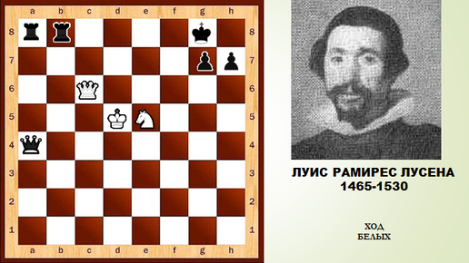 Здравствуйте дорогие любители шахмат. С Вами снова Шахматный дилетант. Я уже рассказывал об одном из первых европейских шахматистов - испанце Луисе Рамиресе Лусене (1465-1530). Рассказ о нём стоит дополнить знаменитой матовой комбинацией, которую европейским шахматистам впервые продемонстрировал именно он. Вообще надо заметить, что шахматная история любопытна тем, что частенько дебюты, комбинации и многое другое придуманное одними шахматистами, получает имена других. Вот например знаменитая позиция...