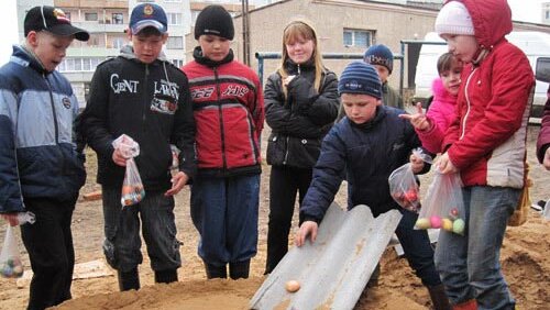 Катание яиц — древняя славянская соревновательная игра, её цель — получить крашенные яйца других игроков. Подходит и для детей и для взрослых. Играть можно и дома и на улице. 1. Устанавливается наклонная дорожка - доска, лоток или желоб из картона или дерева, кусок шифера, разрезанная вдоль пластиковая труба. За лотком - плоское место, например, одеяло или песок, трава во дворе. 2. У каждого участника одинаковое количество крашенных яиц. 3. Считалкой устанавливается очерёдность игроков. 4. Первый пускает по жёлобу своё яйцо, стараясь, чтобы оно покатилось дальше...