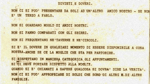 Члены итальянской мафии связаны 10 заповедями, которые включают пунктуальность, избегать запретов и не смотреть на жен друг друга и так далее. Даже самым жестоким бандитам требуется кодекс. Список правил для «идеального» мафиози был найден среди документов, изъятых после ареста Сальваторе Ло Пикколо, человека, который, как полагают, был главой сицилийской мафии после знаменитого "вора в законе" Бернардо Провенцано. Печатный лист бумаги с названием «Права и обязанности» был среди пачек бумаг, которые Ло Пикколо, очевидно, были крайне дороги раз он хранил их при себе...