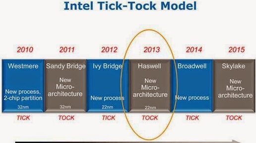 Буквально каждый год компания Intel выпускает новую архитектуру. В этой статье будем говорить об архитектуре Haswell. С 2007 года компания стала разрабатывать процессоры по системе «Тик-так». Суть такого процесса заключается в том, что каждый год мы получаем новую архитектуру с новым техпроцессом. Например, предыдущая микроархитектура Ivy Bridge классифицировалась как «Так». Рассматриваемая сегодня микроархитектура Haswell является «Так».