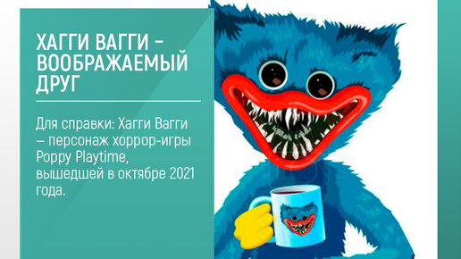 Хагги Вагги, или Хаги Ваги (англ. Huggy Wuggy), — персонаж компьютерной игры Poppy Playtime, первый эпизод которой компания MOB Games выпустила 12 октября 2021 года. Сейчас десятки младших школьников по всему миру играют в Poppy Playtime в новом режиме «Роблокса». По сюжету игры Хагги Вагги — антагонист, который охотится за игроком, бывшим сотрудником фабрики игрушек Playtime Co. Лучше всего огромное антропоморфное существо с синим мехом умеет обниматься (отсюда и название Huggy — от англ. to hug, то есть «обнимать»)...