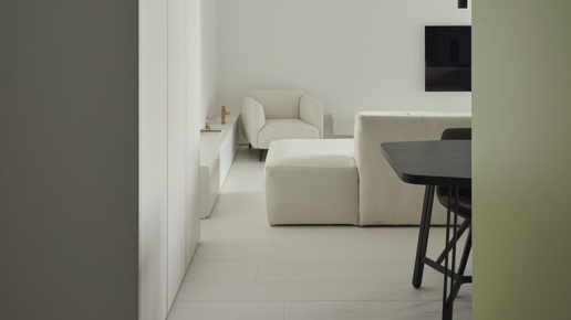 🌫️ Только что сдали этот объект и не можем налюбоваться. Получился тот самый случай, когда минимализм не выглядит стерильным, а выглядит дорогим. Главная фишка — это кухня. Нержавейка вместо фартука + матовые зеленые фасады. Выглядит очень современно. Детали, которые цепляют: ▪️ Черный трековый свет на белом потолке — чистая графика...