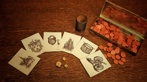 Краткий рассказ об игре с костями и карточками. Механика проста и увлекательна, и оригинальна. Подробной истории игры тут не будет, потому как пока она нам встретилась только в одном источнике. Инвентарь полностью сделан по тексту из книги. Касательно первого пункта мы решили что замок будет амбарный. Источник: