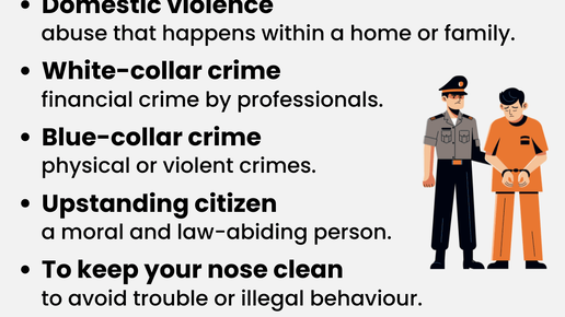Crime and punishment is a common topic in the IELTS Speaking test. Examiners may ask you about crime rates, types of punishment, reasons people commit crimes, or how crime affects society. In this guide, you’ll learn useful IELTS vocabulary for crime and punishment with clear definitions, followed by IELTS Speaking Part 1, Part 2, and Part 3 questions with sample answers. Here is some useful IELTS vocabulary for talking about crime and punishment with clear definitions. These words and phrases will help you give better answers in the IELTS Speaking test...