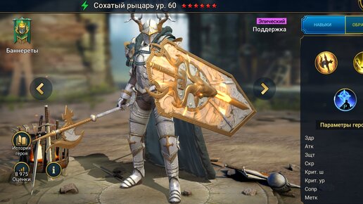 В этом гайде мы рассмотрим героя Сохатый рыцарь, которого все игроки могут получить из древних и сакральных осколков. Сохатый рыцарь - Эпический герой поддержки стихии Духа из фракции Баннереты. Навыки: 1. Погоня за жертвой - Атакует врага 2 раза. Каждый удар с вероятностью 30% накладывает Штраф скорости 30%(с книгами 50%) на 2 хода. Урон зависит от АТК. 2. Мастер охоты - Атака по всем врагам. С вероятностью 70%(с книгами 95%) накладывает Штраф защиты 60% и Штраф атаки 50% на 2 хода. Урон зависит от АТК...