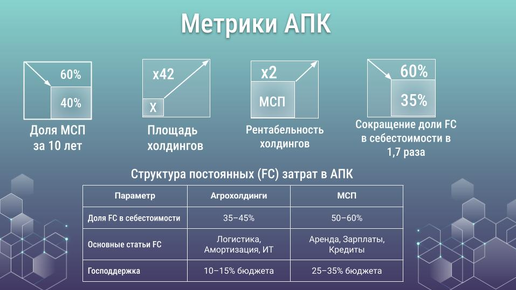 Современный агрорынок напоминает некооперативную игру, где агрохолдинги доминируют за счет масштаба (в среднем 43-кратное превосходство в площадях). Однако их преимущество нивелируется из-за плато рентабельности: снижение постоянных затрат всего в 1,7 раза делает их уязвимыми...