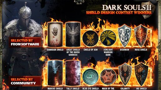 15 апреля 2013 года игрокам и фанатам серии Souls предложили поучаствовать в разработке Dark Souls 2. А именно поучаствовать в конкурсе на 6 лучших дизайнов щитов, которые будут добавлены в финальную версию игры. Работы принимались изначально до 13 мая включительно, но через некоторое время срок продлили до 15 мая включительно. В качестве жури выступали сотрудники From Software. Участников разделили на три группы: Япония (Japan), Европа (EU), Америка (US) и выделили каждой свою форму щита: треугольную, круглую, прямоугольную соответственно...