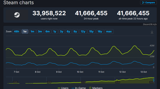 Игровая платформа Steam, один из крупнейших цифровых магазинов и лончеров на ПК, поставила новую рекордную отметку по количеству одновременно активных пользователей. Эта важная веха стала ещё одним свидетельством огромной популярности сервиса и постоянно растущего интереса к компьютерным играм в мире. В начале января 2026 года Steam зафиксировал новейший пик активности: в один момент в сети находились свыше 41,8 миллиона человек одновременно. Это достижение побило предыдущую планку и стало новым абсолютным рекордом для платформы...