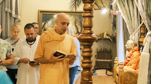 "I offer my respectful obeisances unto His Divine Grace A.C. Bhaktivedanta Swami Prabhupāda, who is very dear to Lord Kṛṣṇa, having taken shelter at His lotus feet. Our respectful obeisances are unto you, O spiritual master, servant of Bhaktisiddhānta Sarasvatī Gosvāmī...