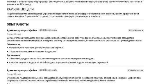 Пример резюме администратора кофейни — это ваш главный инструмент для успешного трудоустройства в этой сфере. Изучение готовых примеров поможет быстро составить по-настоящему эффективное резюме, которое точно привлечет внимание работодателя. ✨ В этой статье мы подготовили подробное руководство о том, как составить резюме администратора кофейни с учетом всех современных требований работодателей. Используя наши пошаговые инструкции, вы узнаете: Мы предлагаем готовые примеры резюме как для начинающих, так и для опытных специалистов...