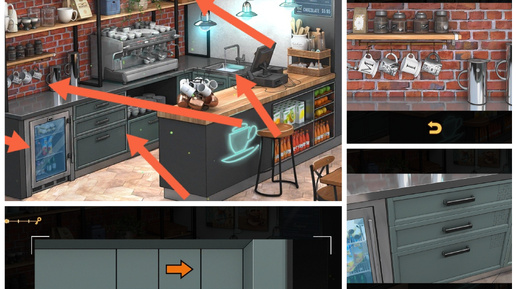 Прохождение игры Rooms & Exits Глава 1 У воров нет чести Уровень 4 Кафе Обновленная версия 2024г. Приступаем - Слева в маленьком холодильнике, с прозрачной дверью, берём банку газировки - Переходим выше, на крючка висят кружки, в них берём открывашку - В инвентаре, открываем банку открывашкой, получаем подсказку Жёлтые стрелки - Правее 3 ящика, жёлтая подсказка соответствует, нижнему Поворачиваем стрелки, как на подсказке, соответственно, с цветом и без - получаем подсказку, для среднего...
