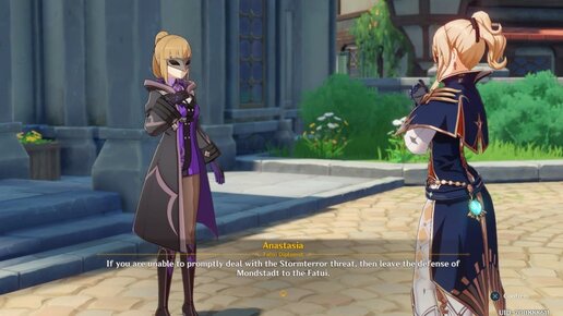 Чтобы начать вторую главу Пролога, вам нужно поговорить с Джинн у фонтана Мондштадта. Она попросит вас пойти в Штаб рыцарей, чтобы продолжить обсуждение, но история не продвинется, пока вы не уйдете. После этого появится некая дама в маске, которая всем своим видом покажет, что ничего хорошего в будущем вас не ждет. На балконе, снаружи штаб-квартиры, вы сможете поговорить с Паймон, и она укажет на мальчика в зеленом, которого вы видели ранее. Спрыгивайте вниз с помощью парения, а затем посмотрите забавную кат-сцену...