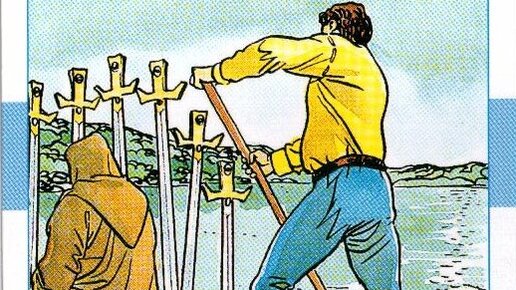 6 мечей, это тот случай, когда форма не соответствует содержанию. В целом карта выглядит мрачно, люди какие-то в балахонах, лодка куда-то плывет, ну и опять масть такая недружелюбная. Но вот какое дело,...