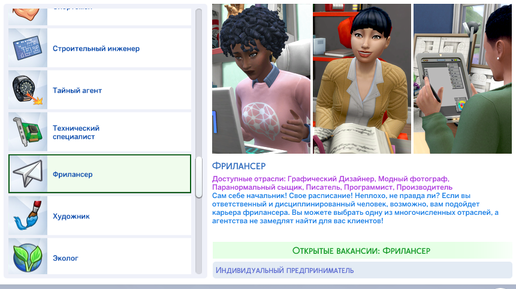 Карьера фрилансера была добавлена с обновлением 1.51.75.1020. У этой карьеры есть 6 отраслей (3 из них доступны в базовой игре): Чтобы взять заказ (подработку) нажмите на кнопку "Искать подработку" которая находится на панели карьеры, там будет доступно 10 заказов (заказы обновляются каждый игровой день) и с 1 заказа можно получить от 100 до 6850 симлеонов...
