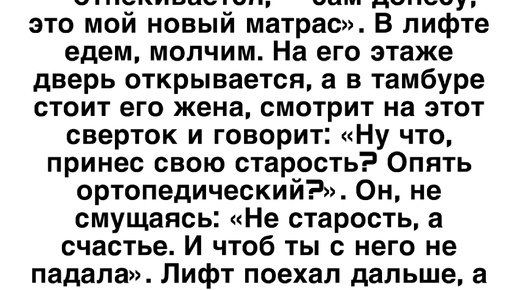 Зашла в лифт с соседом-пенсионером, он нес огромный, явно тяжелый сверток. «Ох, — говорю, — дайте помогу». «Не-не, — отнекивается, — сам донесу, это мой новый матрас». В лифте едем, молчим...