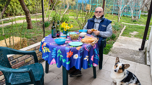 Все наши три кошки вышли, погреться на солнце. Маруся заняла лучшее место на смотровой площадке. Мамаша Че с Кокошкой устроились где придётся. Сразу вспомнился замечательный советский фильм "Республика ШКИД" с предвыборной речью Цыгана: - Старшему отделению - горбушки! Младшему..., тоже по-справедливости. Мы тем временем садимся завтракать на открытой террасе. Утро тёплое, в меру солнечное, ветра нет, в общем, красота. Кошки, несмотря на то, что сами успели уже получить и первый, и второй завтраки, всё же не были бы против того, чтобы пристроиться поближе к нашему столу...