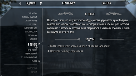 Этот интересный квест выдается управителем ярла, который переживает что его босса и благодетеля примут за злокрыса и случайно отравят, а если не повезет - еще и пиво испортят. Первоначальная задача проста - стырить(или если вы за доброго Довакина, то ненадолго позаимствовать с обязательным возвратом) копию конторской книги в "Котелке Аркадии". Воруется все просто и легко, никаких особых навыков не понадобится. В книге можно найти два упоминания о покупке ядов, эти места и будем проверять. Хотя,...