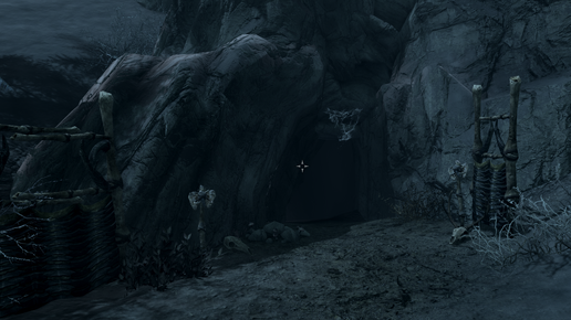 Бежал рассказать про еще один новый дом в Skyrim Anniversary Edition, но пока добежишь всегда встретишь что-то интересное и руки зразу чешутся об этом написать. Находится эта забавная пещера вот здесь: С первых шагов меня зацепил разговор двух бандитов, в котором упоминаются две интересные вещи: стыренный лучший шлем у одного из криминальных элементов и то что воры явно фалмеры. А фалмеры - это как правило интересные пещерки. Дальше больше. На дне пещеры обнаруживаются кости мамонта, хотя это я сумел разгадать посмотрев вверх...