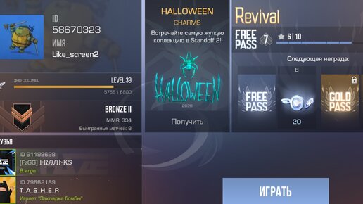 Это главное меню. Здесь есть ваше айди с помочь которого вас можно найти в игре,ваше имемя в игре уровень и звание...