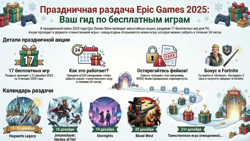 Каждый год в декабре игровое сообщество замирает в ожидании. Не из-за снега за окном, а из-за «цифрового снегопада» подарков от Epic Games Store. Праздничная раздача 2025 года — не просто акция, это грандиозное шоу щедрости, стратегический ход гиганта индустрии и настоящий праздник для миллионов. Epic Games не просто дарит игры — она запускает марафон, где первым же подарком оглушает всех: легендарная Hogwarts Legacy становится бесплатной. Это громкое заявление, после которого уже нельзя пройти мимо...