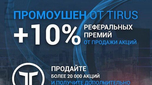 Мы объявляем о старте нового промоушена 🆕 Сроки проведения: с 12 ноября 2019 по 12 декабря 2019 Условия: продай более 20 000 акций и получи дополнительно + 10% в качестве премии!!! 😍 Зарабатывайте вместе с Тайрус🍒 https://tirus...