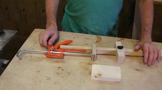 Идея сделать быстрозажимную струбцину таким образом, в общем то лежит на поверхности. И это скорее проба, что может получится. В качестве основы струбцины я решил применить скелетный пистолет для герметиков. Обрезал у него верхнюю часть, а к нижней прикрепил брусок из ясеня. В этом бруске просверлил несколько отверстий для изменения положения заднего прижима. К толкателю пистолета я прикрутил толстую фанеру с вырезом под брусок. В целом довольно просто и результат вполне приемлемый. Такой струбциной можно прижимать заготовки к верстаку...