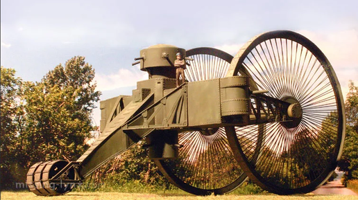Царь-танк был спроектирован русским инженером Николаем Лебеденко в 1914 году. В 1915 построили единственный экземпляр. Данный проект был поистине уникальным. Он поразил своей оригинальностью тогдашнего императора Российской Империи Николая II. Последний, собственно, и выделил 210 тысяч рублей на постройку полноценной машины. Внешний вид В движение машину приводили два колеса диаметром 9 метров. Корпус размещался позади них и был похож на букву T. Сзади располагался каток диаметром 1,5 метра. Характеристики Экипаж машины составлял 15 человек...