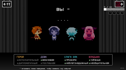 Как очевидно из названия, это буквально "театр плохих концовок". 4 персонажа, куча выборов, после которых открываются параметры для персонажей, которые открывают больше концовок, которые открывают больше параметров, которые... ну вы поняли. Тут аж 41 плохая концовка, а после открытия всех можно посмотреть одну хорошую и секретную (секретная правда попадает под статью 6.21 КоАП РФ, асу 🤨🤨🤨)...