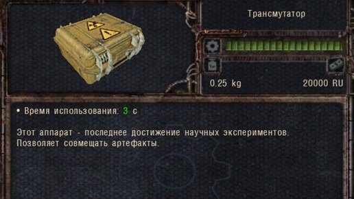Привет. Не забывайте листать галереи. Впервые трансмутатор появляется в продаже у профессора Сахарова в локации Озеро Янтарь. Затем его можно купить в бункере ученых на Цементном заводе (не дороже 25000). Также попадается в некоторых тайниках ближе к концу прохождения. Представляет собой желтый контейнер с предупреждающими знаками. Предназначен для соединения трёх артефактов и получения одного улучшенного. Потребуются рецепты, которые также продаются у ученых на Янтаре и Цементном заводе. Чтобы использовать трансмутатор, надо в инвентаре кликнуть на нём ПКМ и "использовать"...