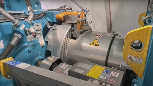 Нам разрешили поснимать внутрянку ветрогенератора в момент проведения профилактических и сервисных работ. Заходим в башню, и там есть два способа подняться в гондолу: по лестнице ножками и при помощи подъёмного механизма. Мы выбрали второй способ, потому что подниматься по лестнице на высоту 131 м - это то ещё удовольствие. Попадаем внутрь гондолы. Это то самое место, где расположены основные энергогенерирующие узлы и агрегаты. Сразу же видим небольшой асинхронный электродвигатель. Их здесь 4 штуки, и они вращают привода ориентации всего ветряка относительно направления ветра...
