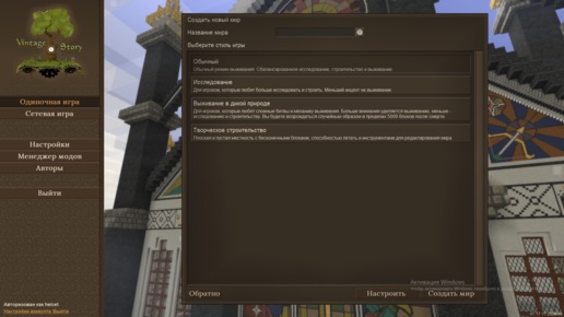 Итак вот вы и докатились до игры в Vintage Story, с чего-же начать? Сейчас расскажу, ну первым делам надо создать мир (для этого надо нажать "Одиночная игра"->"Создать новый мир") игра предложит выбрать "стиль игры" для новичков более подойдёт тип "обычный" - он наиболее сбалансированный. Ещё советую выставить фору(дает время до появление монстров). После настройки мир можно создать...