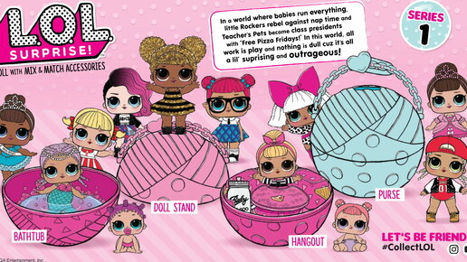 L.O.L. Surprise! Series 1 Первая серия, с которой всё начиналось! Шарик-упаковка — ванна и подставка для куклы, а также сумочка. В первой серии куколки были поделены на 8 тематических категорий (клубов), всего 28 кукол: