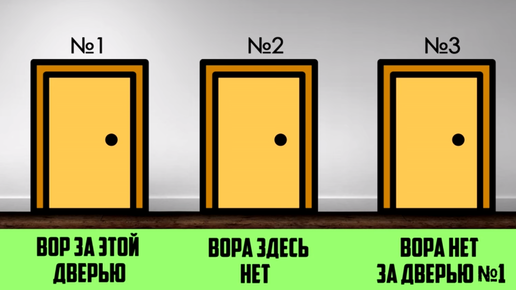 За одной из дверью спрятался вор. Найдите вора, учитывая, что только одно утверждение правдиво. Подумайте, не спешите. Ответ вы сможете найти под фото. Ответ: Вор находится за дверью номер 2. Эта задача очень просто решается методом исключения...