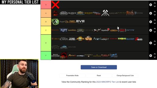 Мне всегда нравилась ММОRPG-движуха, и я решил посмотреть на игры, которые всунул в так называемый за рубежом "Tier List", что означает на русском "рейтинг", один из MMORPG-обзорщиков – TheLazyPeon. Вот ссылка на его YouTube-канал, а вот скриншот из видео, которое называется "MMORPG Tier List 2023", то есть рейтинг ММОРПГ 2023 года: Для начала, давайте объясню как читать данный рейтинг. S обычно означает что данный ряд имеет самые крутые ММО, остальные A,B,C и так далее, это просто английский алфавит, чем первее буква в алфавите, тем соответветственно выше ряд, а значит и круче игра...