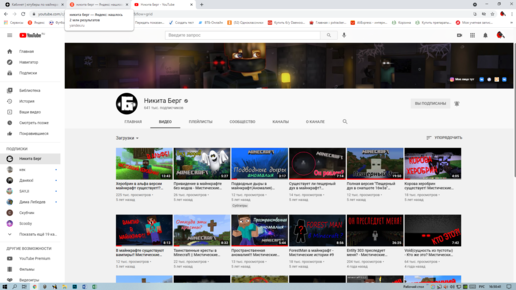 привет друзья в мире много ютуберов по майнкрафту очень много из них снимают то выживание то прохождение карт но кто-то снимает и мистику и сегодня несколько ютуберов снимающих мистику по майнкрафту Никита Берг ютубер начел канал с 2014 года его первый ролик был такой у Никиты Берга 641 тысяч подписчиков и 71 538 133 просмотра живёт в Украине снимает такие рубрики как реальная мистика, 10 дней выживания, проверка сидов и т.д. также часто проводит стримы где играет на мистических...