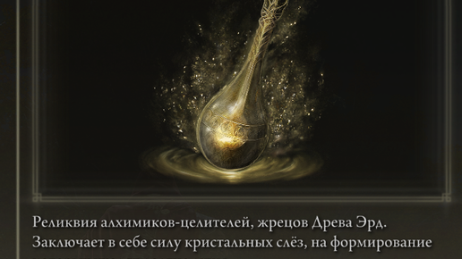 Фляга с чудесным снадобьем (Фляга) – позволяет смешивать кристальные слёзы получая снадобье, выпив которое персонаж получает баф на 3 минуты. Снадобье можно выпить 1 раз. Сосуд наполняется повторно после отдыха в месте благодати. Фляга находится на востоке Замогилья в «Третьем храме Марики. После получения Фляги её необходимо наполнить. Для этого нужно отдохнуть в месте благодати и в меню выбрать «Смешать чудесное снадобье». Мавзолей – выглядит как ходячее здание с колоколом. Мавзолей позволяет удвоить воспоминание, получаемое за убийство некоторых боссов, даже если вы извлекли из него силу...