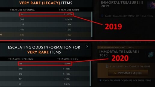 Шансы на получение редких наград при открытии Immortal Treasure в Battle Pass 2020 снизились примерно в два раза. Своими наблюдениями и подсчетами поделился пользователь Reddit Cool_Hector. На изображении...